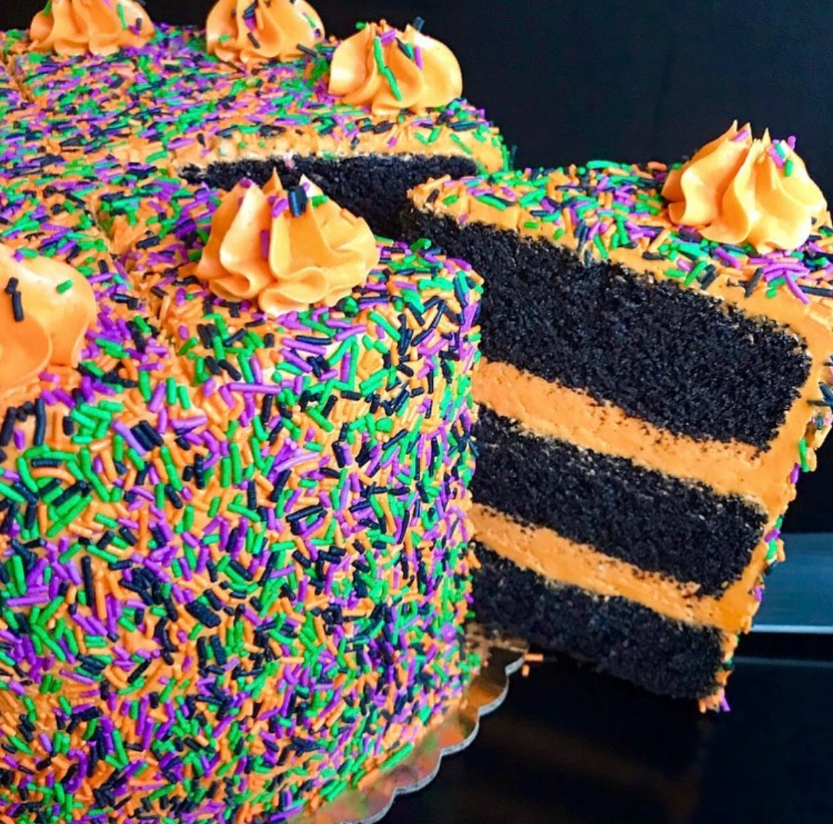 One slice of our October cake flavor of the month! Three layers of pitch black chocolate cake frosted with orange tinted butterscotch buttercream and covered with allllll the spooky sprinkles!