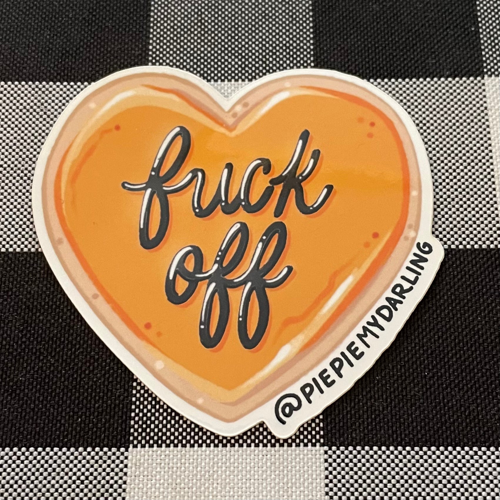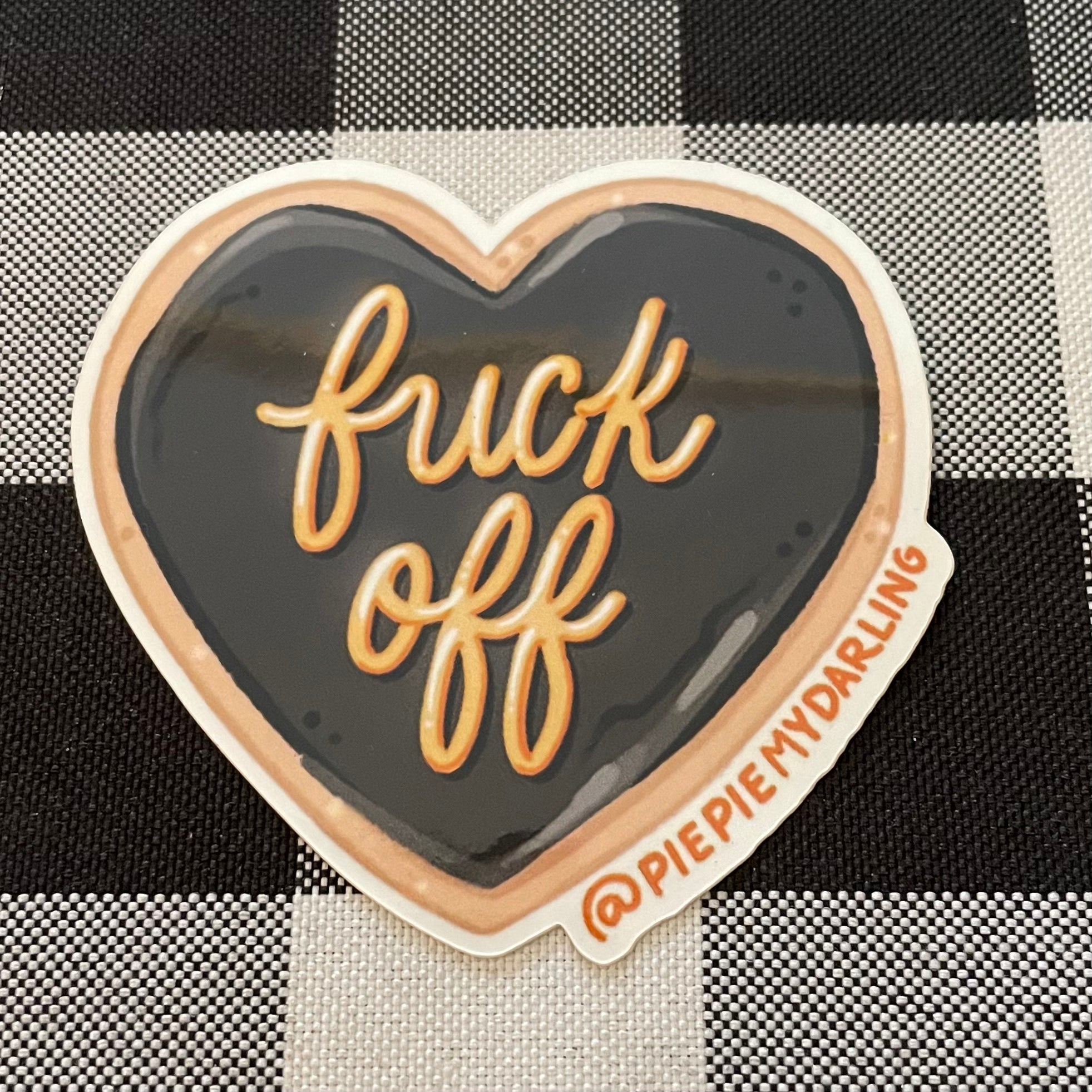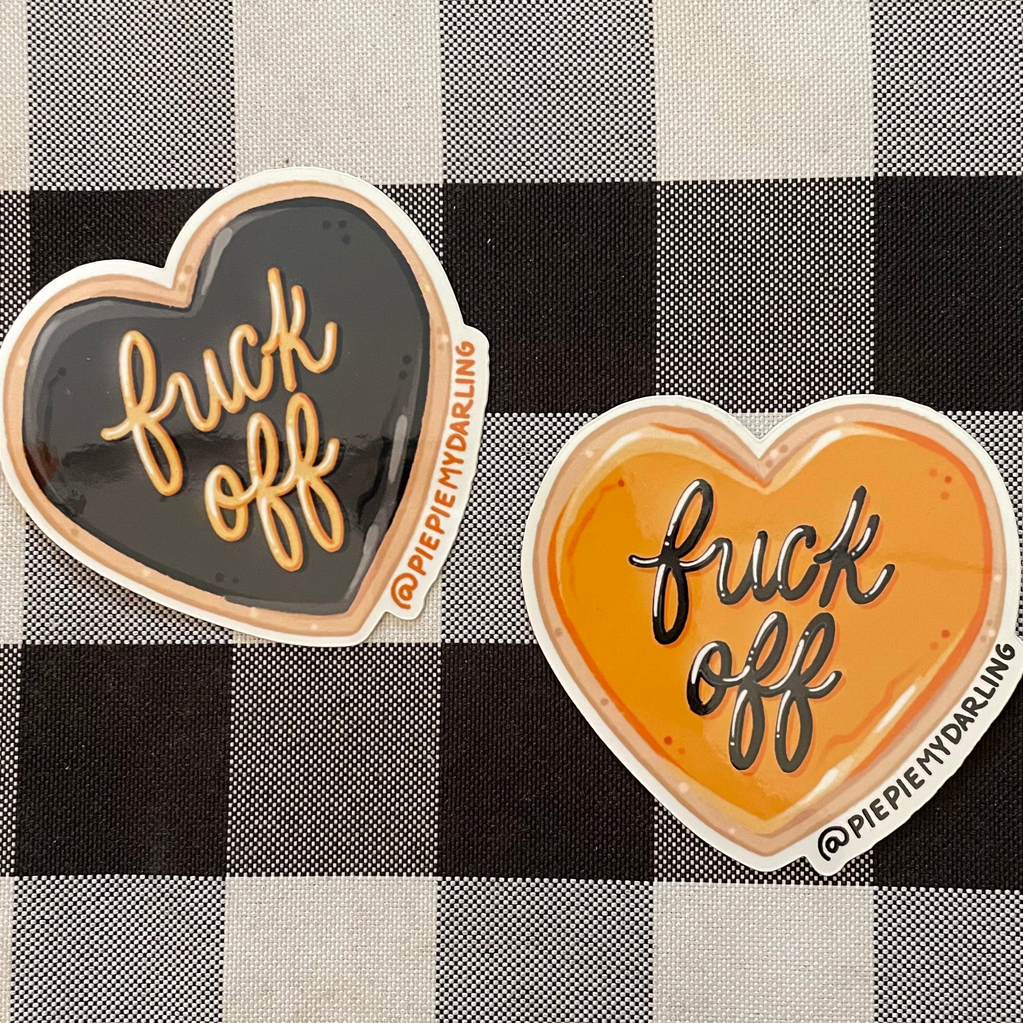 2.88 x 3inch glossy die-cut sticker of our signature "fuck off" sugar cookie! In your choice of black with orange writing or orange with black writing!