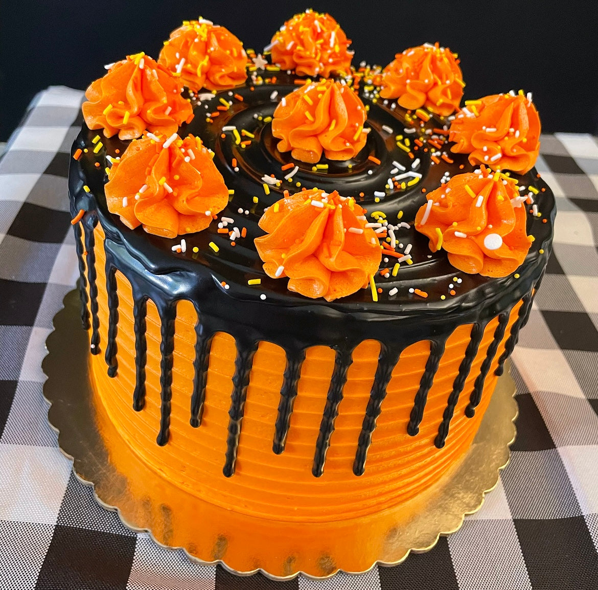 Layers of pitch black chocolate cake frosted with orange tinted butterscotch buttercream and topped with black tinted chocolate ganache drip and festive orange, yellow, and white sprinkles.