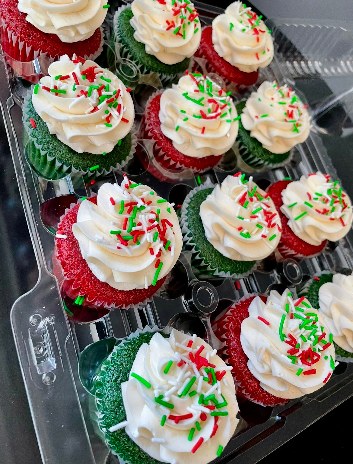Layers of red and green velvet cake filled & frosted with cream cheese buttercream and covered in festive red, green, and white sprinkles!