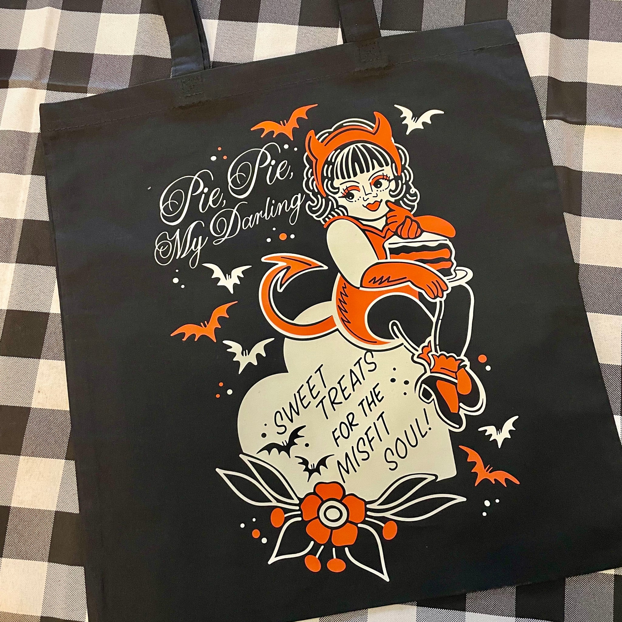 Black 100% cotton tote bag printed with our spooky szn design created by our local bestie @sweetpeachtattoos!